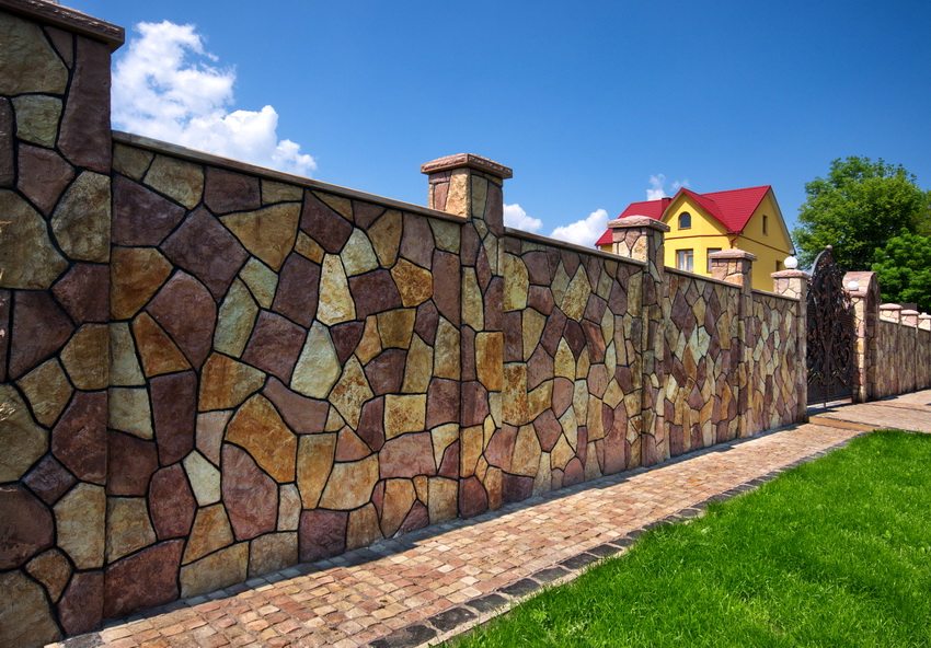 Заборы из бетона представлены в разных вариантах. Они бывают и монолитными, то есть из цельной бетонной стены, и блочными (из бетонных блоков). Бетон хорошо использовать для забора в сочетании с другими материалами, например, перемежая блоки коваными или деревянными элементами. На него можно нанести любой узор или покрасить.