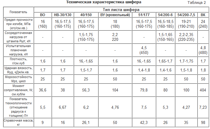 Прессованные листы отличаются большим удельным весом и большей механической прочностью. В таблице приведены технические характеристики прессованного и непрессованного плоского шифера.