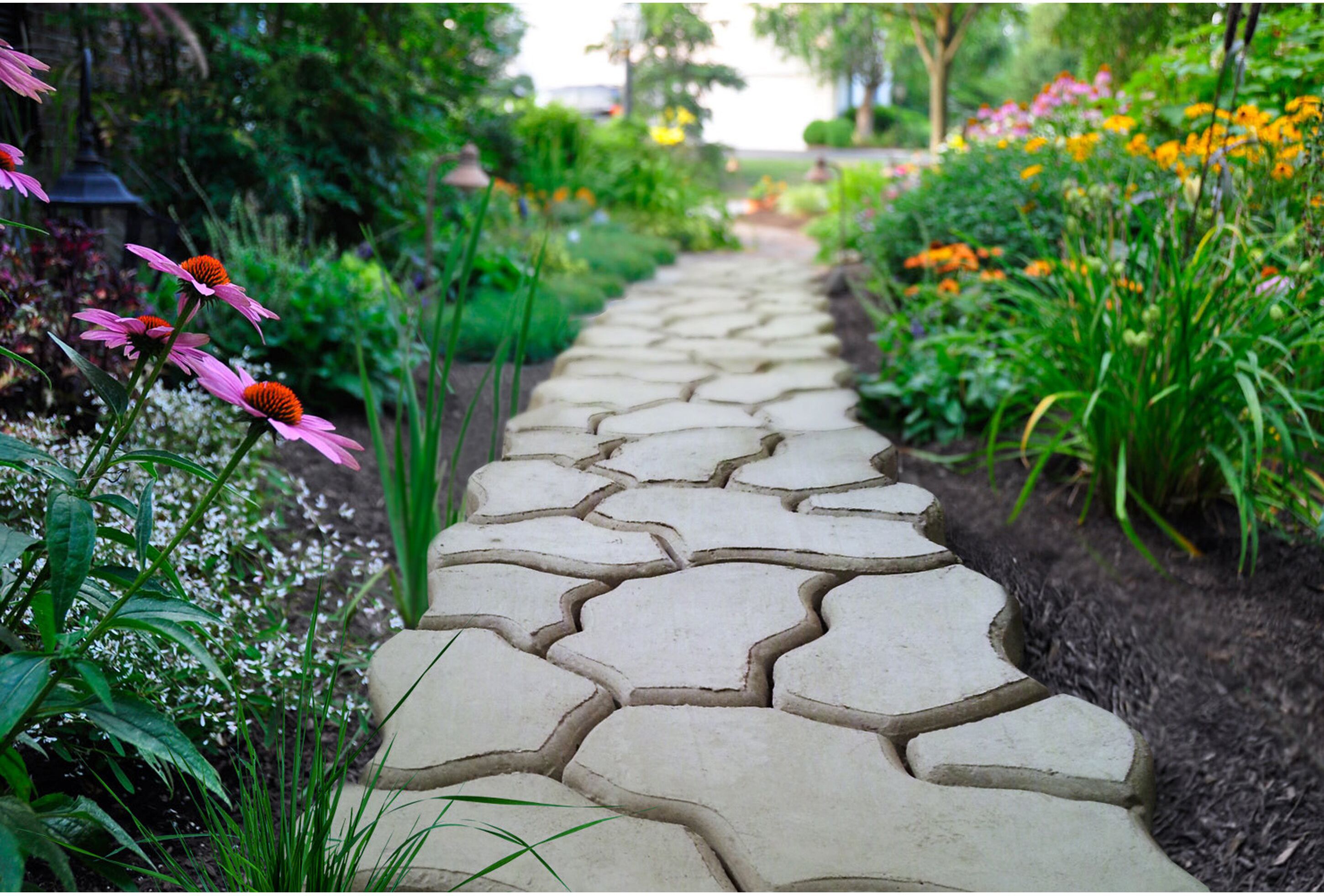 - Сочетать два стиля очень просто, например, подъездную дорожку из плитняка, вырезанную вручную и окрашенную по индивидуальному заказу, с бордюром из штампованного бетонного булыжника.