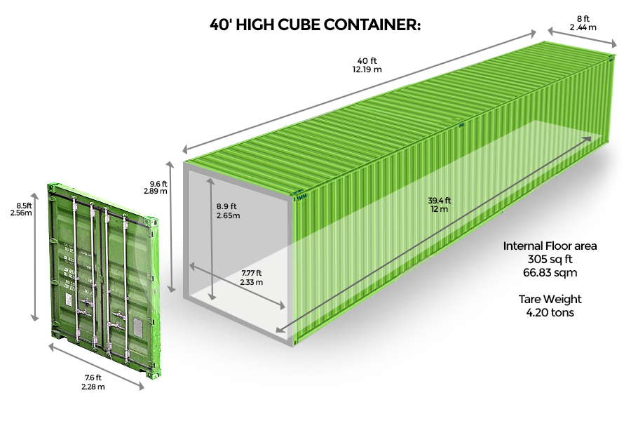 Стандартный 40-футовый транспортный контейнер имеет внутреннюю ширину 7,9 футов (2,4 м), высоту 7,9 футов (2,39 м) и внутреннюю длину 39,5 футов (12,03 м). 40-футовый контейнер — популярный выбор для перевозки сухих грузов на судах.