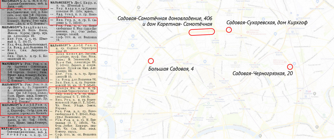 Мы взялись за старые карты Москвы и стали размышлять, где мог бы стоять этот дом. Если забыть адреса возможных Мальмбергов, то можно предположить, что дом находится на внешней стороне Садового кольца — в XIX веке там была более свободная застройка.