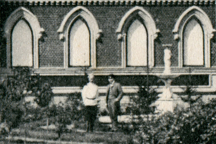 Кадр с открытки сделан в ясный солнечный день, и мы попробовали определить местоположение дома по наклону теней от деревьев — так можно предположить, в какую сторону света он повернут, а это поможет найти на картах наиболее подходящее место.