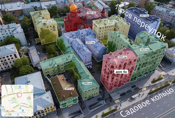 - на углу Садового кольца и Лихого переулка особняк с открытки не поместился бы — мало места и много сохранившихся исторических зданий;