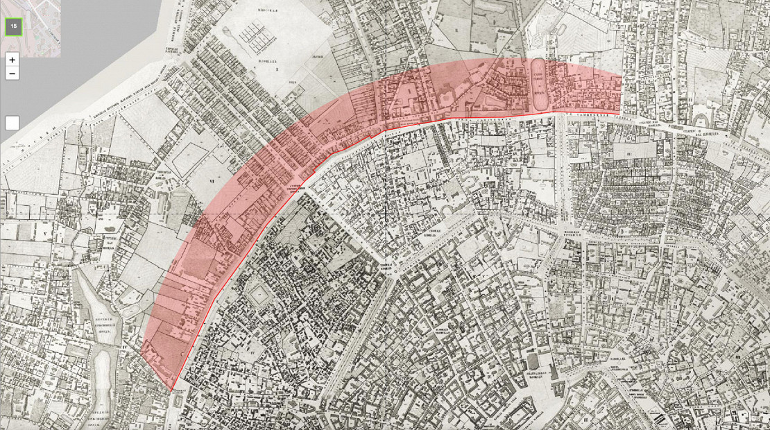 Зона поиска с учетом теней от солнца на фотографии на карте 1852 года