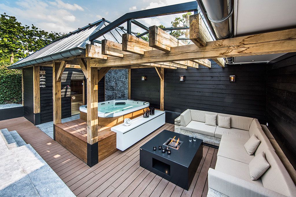 В первом примере использование деревянной облицовки в качестве стенового и фронтонного софита помогает визуально связать конструкцию верхней крыши со стенами, делая объем читающимся как единый элемент.