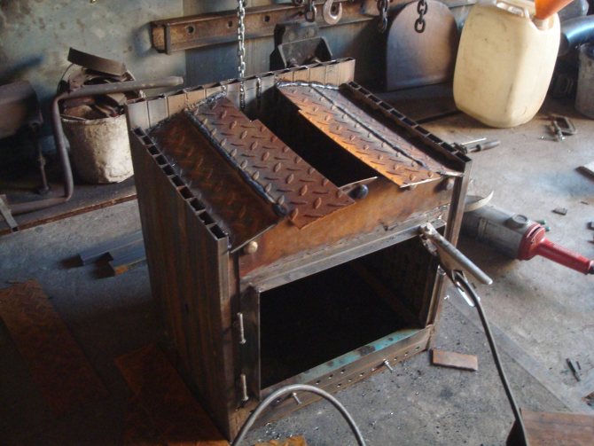После этого подготовьте верхнюю стенку – вырежьте в ней отверстие диаметром 10 мм и приварите к нему патрубок длиной 15 cм. Затем прикрепите сваркой крышку к четырем стенкам. Далее надо прикрепить ножки и сделать дверцы для печи из листа толщиной 4 мм. К дверцам приварите петли и установите на печь, сделайте ручки из стального прута.