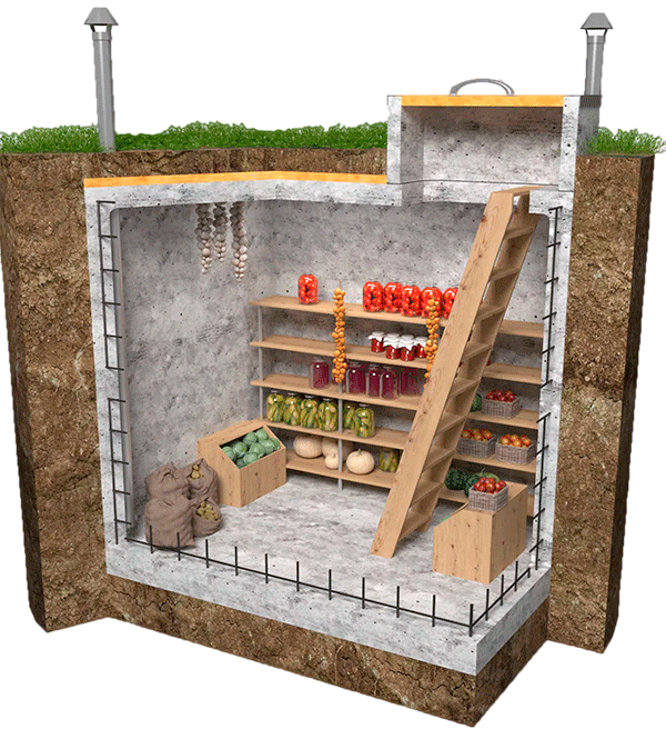 - Для наружных подвалов предпочтительнее использовать утрамбованную землю. Бетон хорошо подходит и удобен для погреба в подвале.