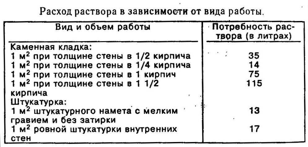Кладочные растворы для кирпича рассчитываются по разным технологиям, но есть нормативные значения объема материала для стен с разным диаметром: