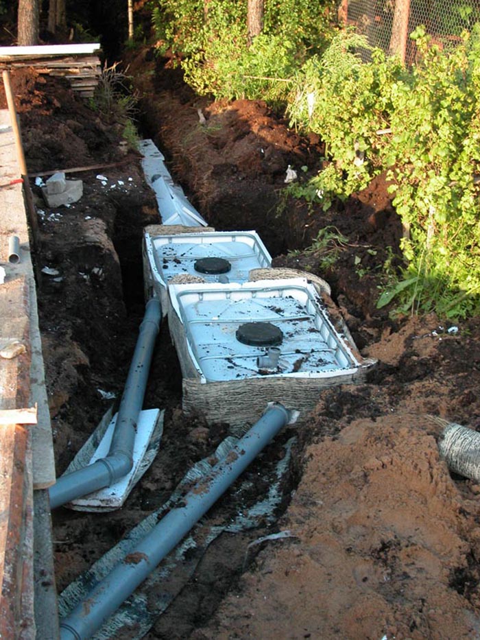 При копании осторожно прокладывайте туннели под корнями больших деревьев, стараясь не повредить их. Скалы придется раскопать; при необходимости арендовать электрический отбойный молоток. Помните, важно, чтобы дно траншеи оставалось ровным, чтобы вода могла свободно проходить через систему.